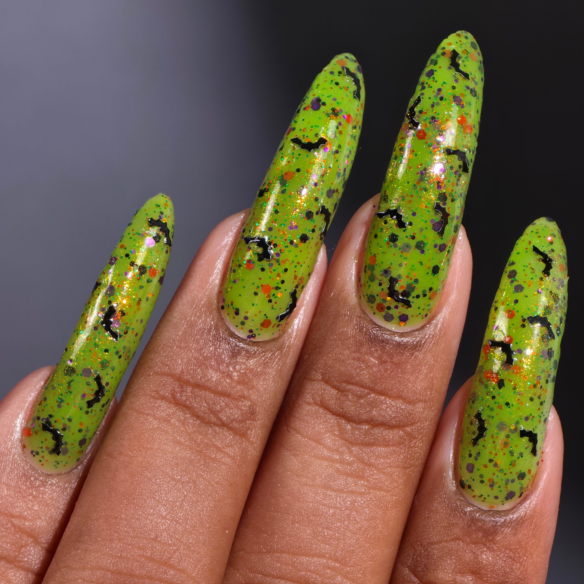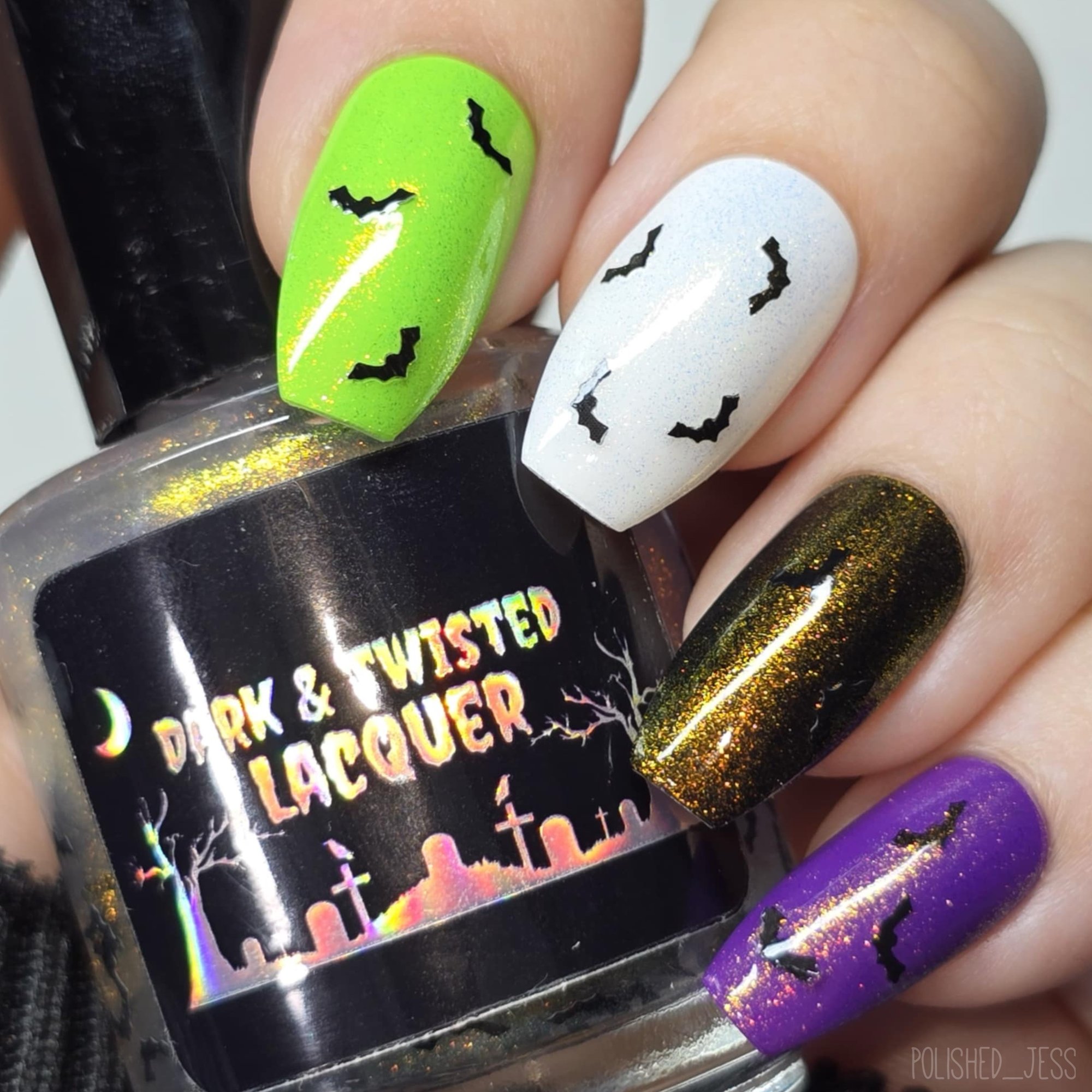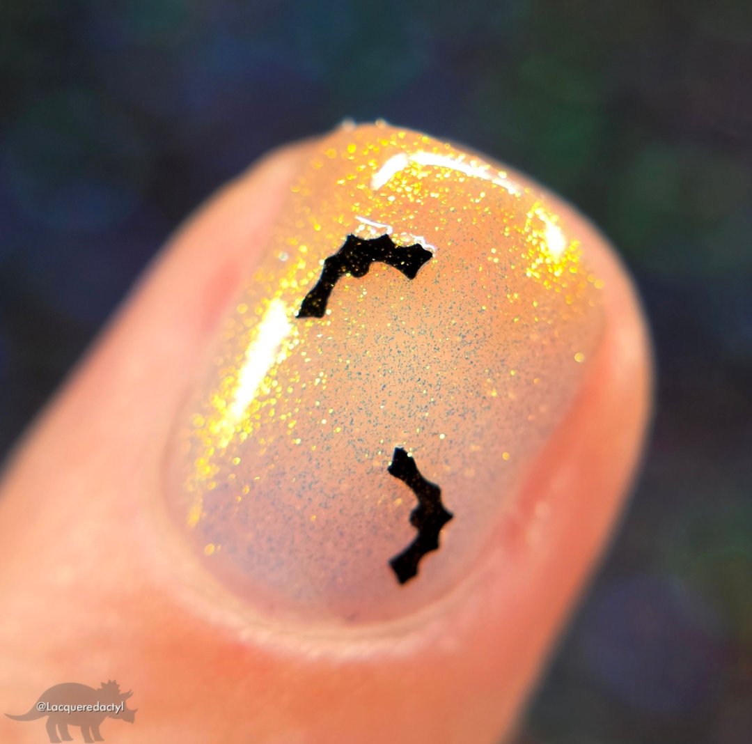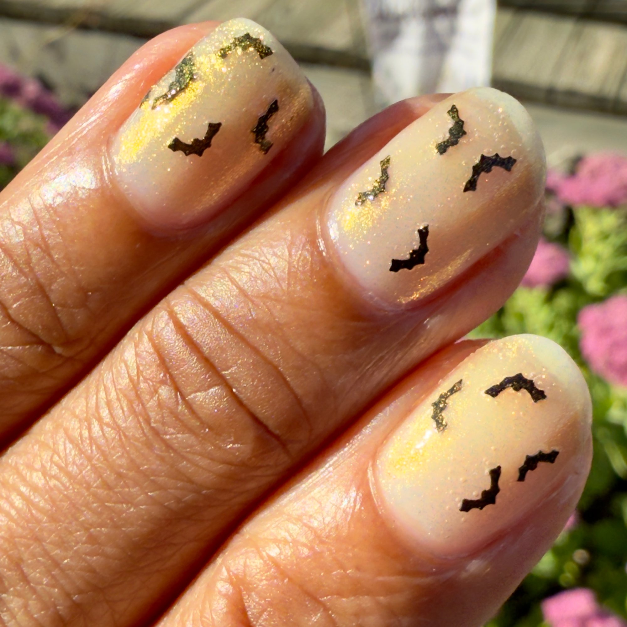 This polish is a topper but can be build up but will still be somewhat sheer. Each bottle of this polish will come with a small pkg with about 20-30 tiny bats 🦇🦇🦇 to add to your Halloween manis. 🥰