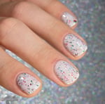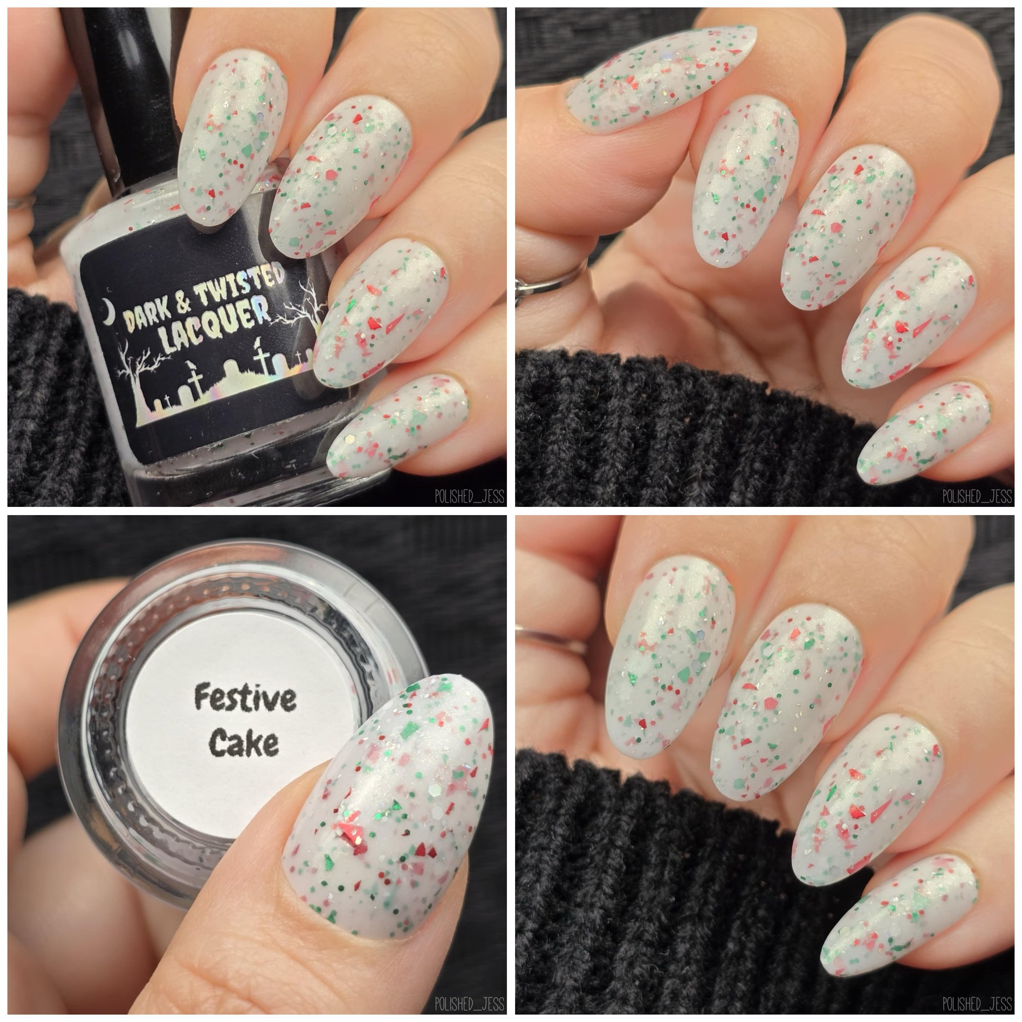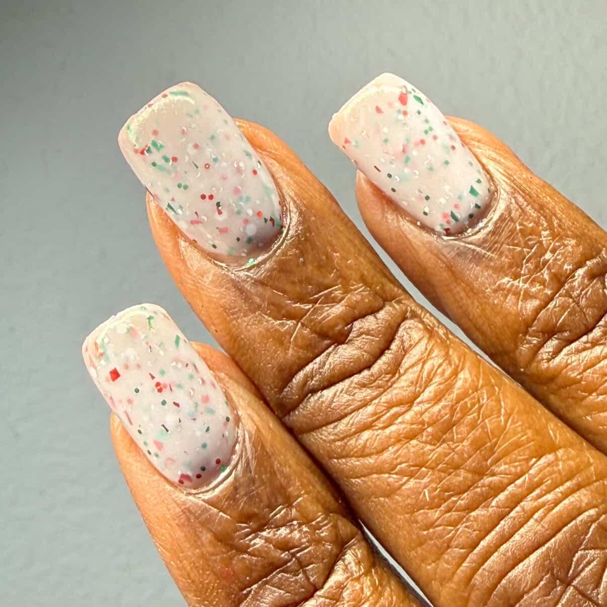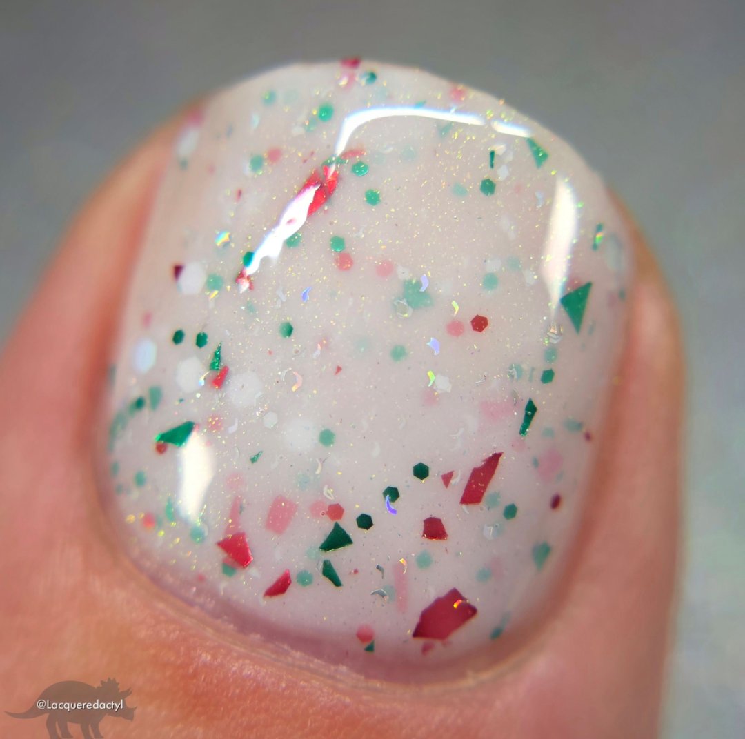 This polish is a white crelly full of red & green glitters & shreds & subtle green/gold shimmer.