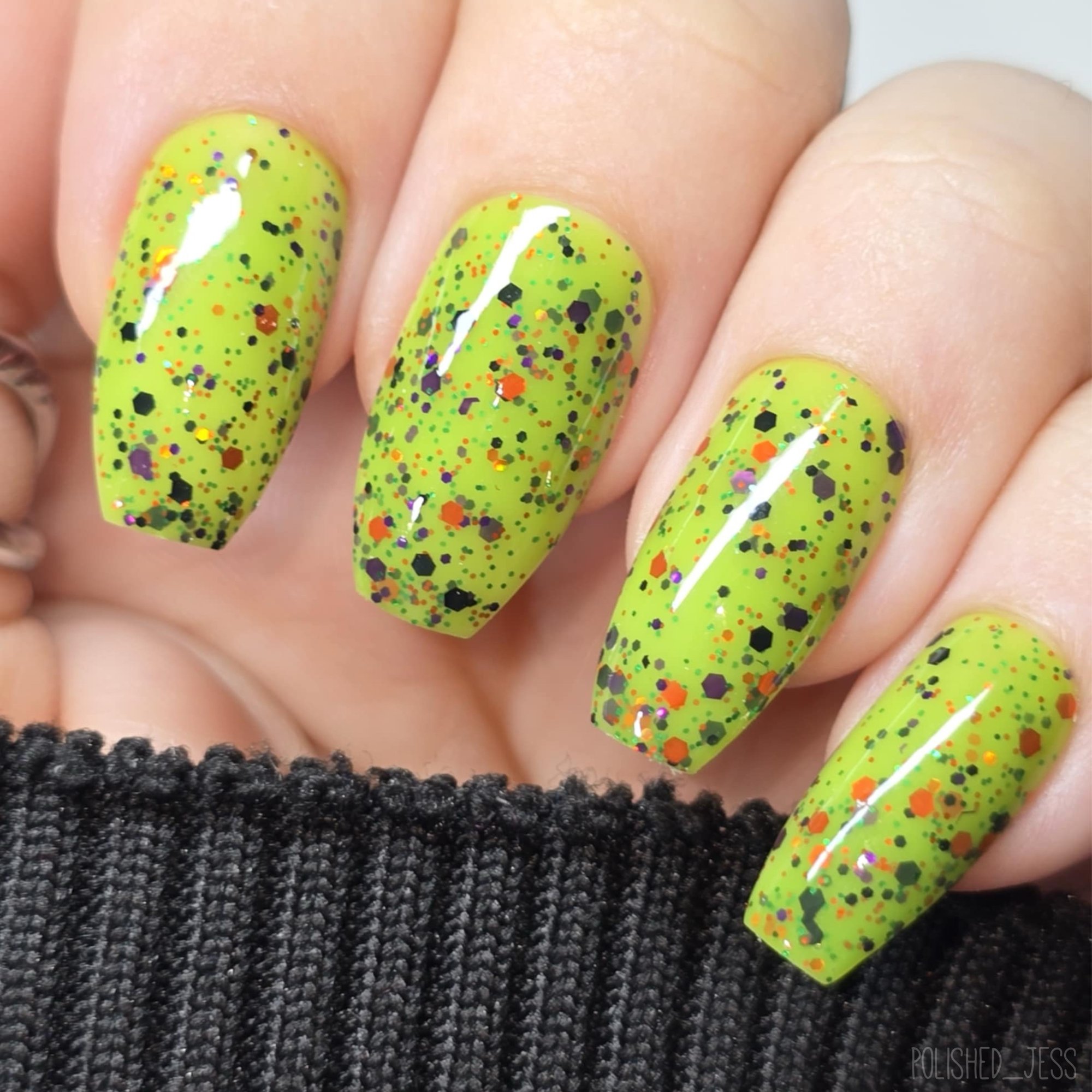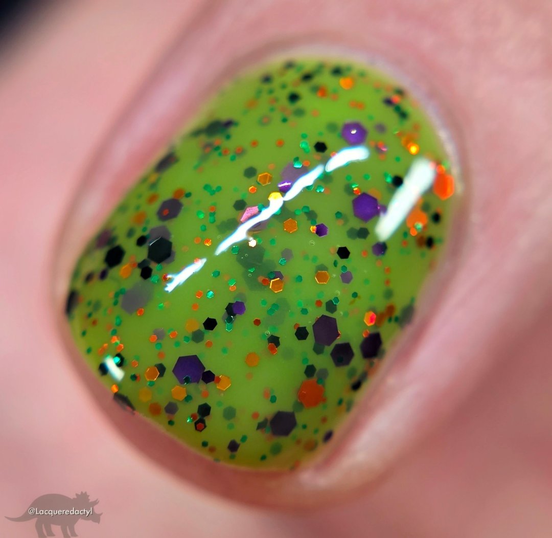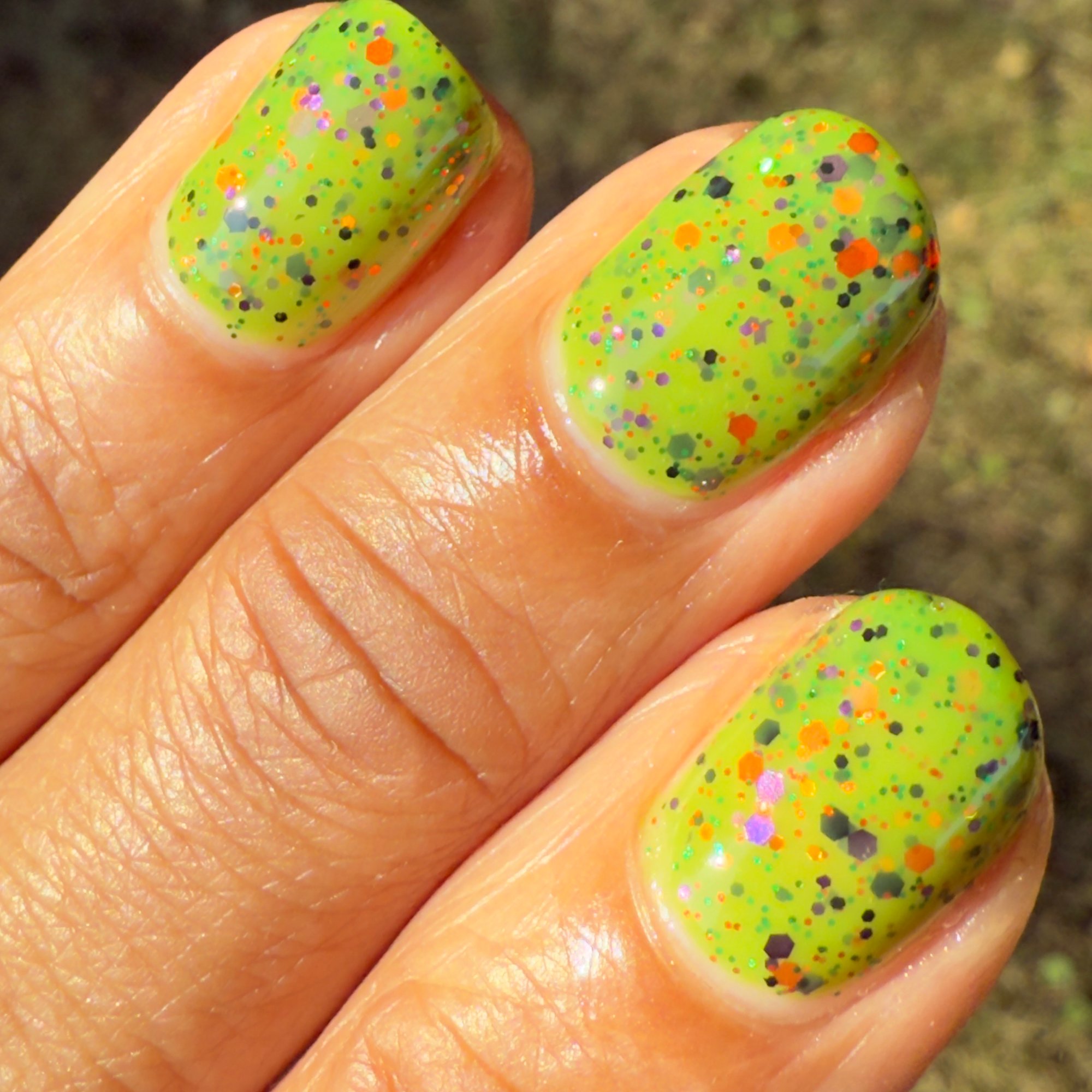 This polish is a prugly green base full of orange, green, black, purple holo glitters.